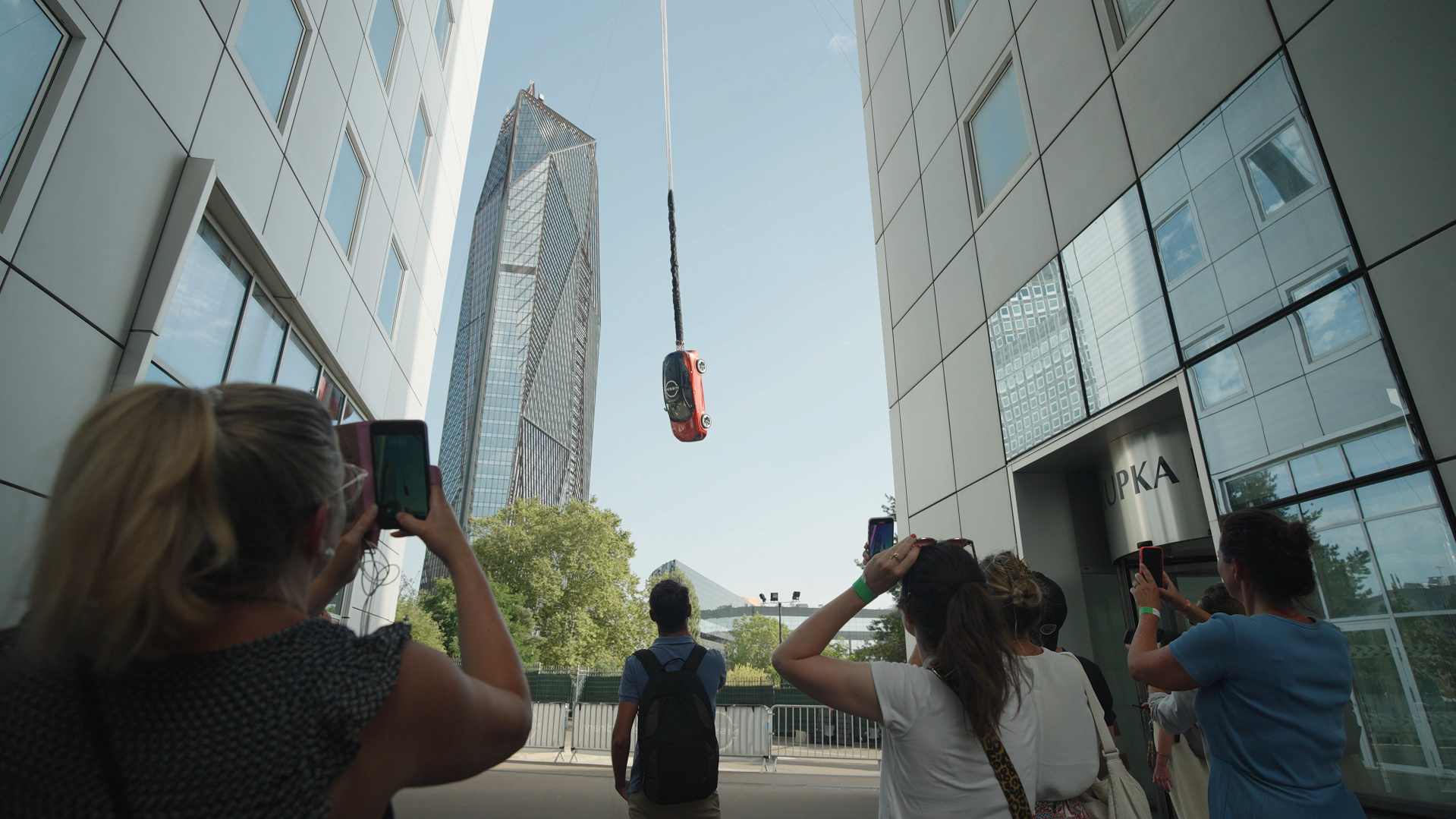 The filming location, La Défense, was a huge part of the vision for Nissan France. Based loosely on a previous viral video, the urban city vibe, along with the sleek, open design of the cage, was a key element of the concept. The final shots of the Qashqai tumbling down narrowly between towering buildings, reflecting in the sleek glass panes of Paris’ financial sector, was exactly what Nissan France had envisioned