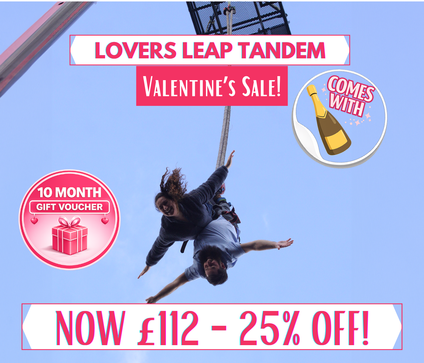 Valentine's Day Special Offer: 25% Off the Lovers’ Leap Tandem Bungee - a 160ft Tandem Bungee Jump with a bottle of bubbly at the end!