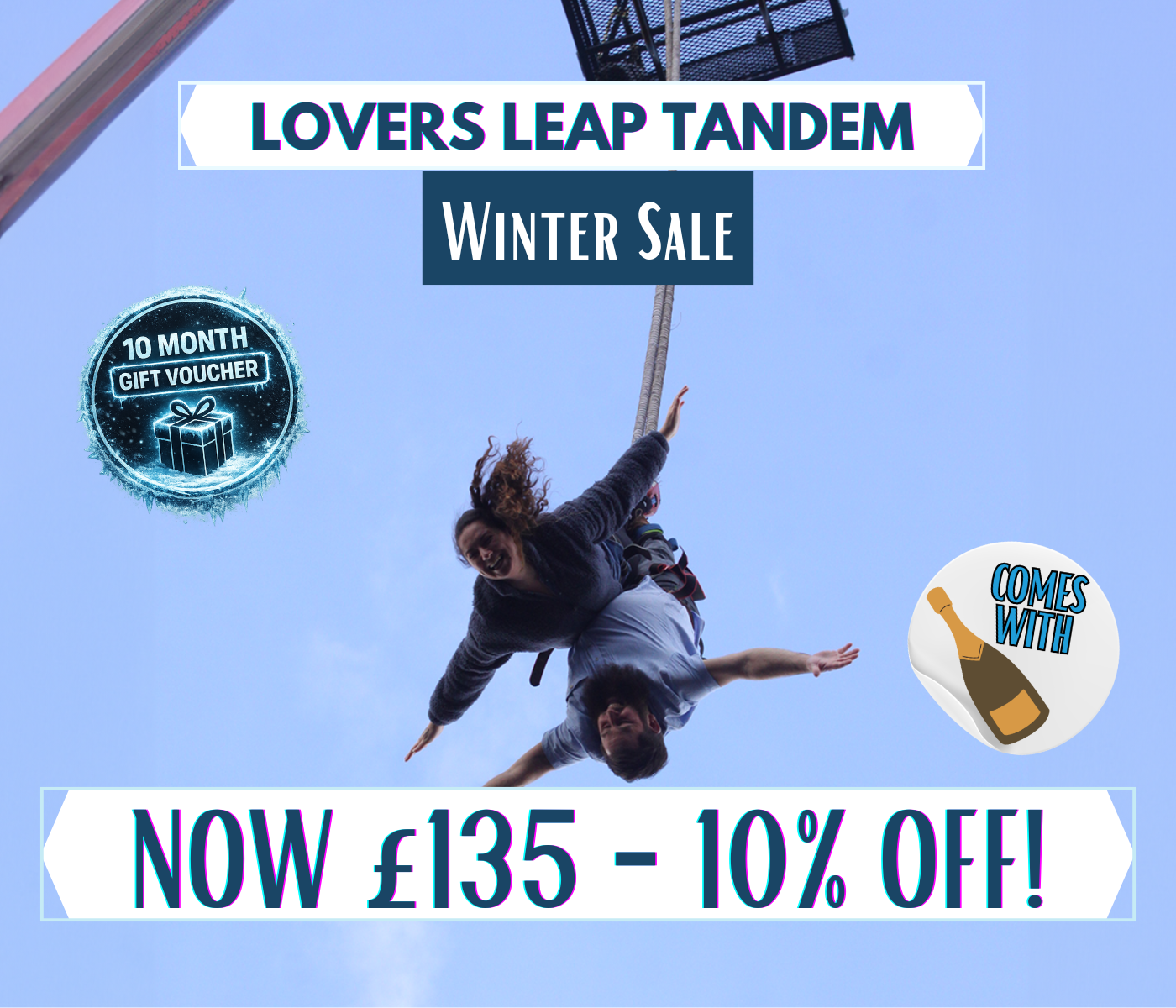 Special Offer: Save 10% on the Lovers’ Leap Tandem Bungee - a 160ft Tandem Bungee Jump with a bottle of bubbly at the end!