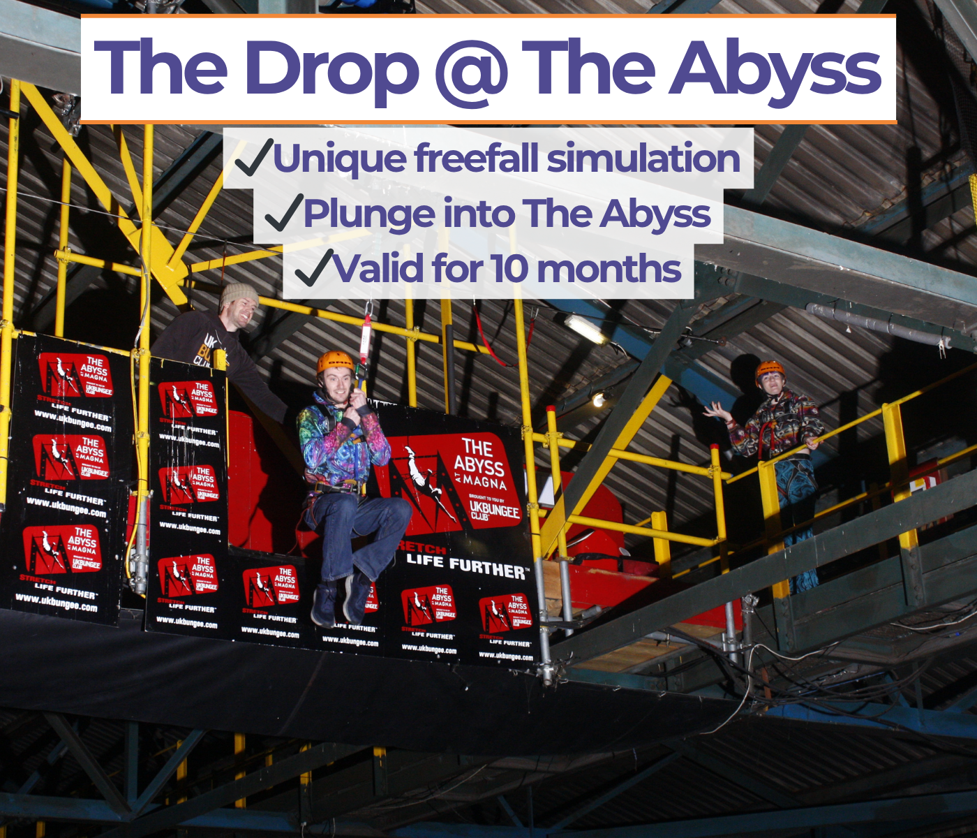 Don't miss this opportunity to experience The Drop, a powerfan experience which mimics the feeling of freefall, for just £40! This truly unique experience takes place in the atmospheric Face of Steel Building at The Abyss @ Magna. Magna Science Adventure Centre, once a bustling Steelworks in the heart of Sheffield, is home to this 150ft freefall experience.